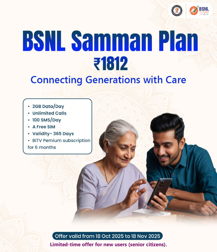 - BSNL Samman Plan: ₹1812 Annual Prepaid For Seniors 365 Days Validity, Unlimited Calls & 2GB Daily Data