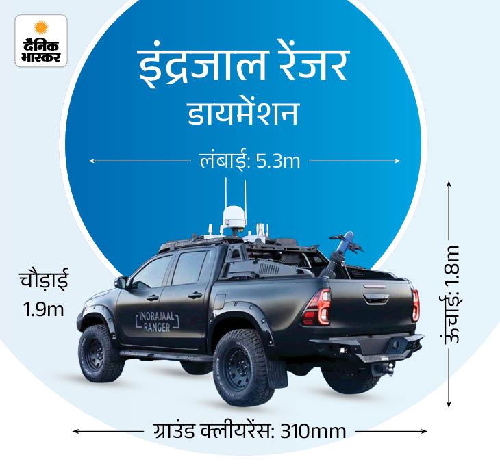एक्सटीरियर: 4×4 ऑल-टेरेन व्हीकल इंद्रजाल रेंजर एक 4×4 ऑल-टेरेन व्हीकल है, यानी हर तरह के सतह पर चल सकता है। इसका एक्सटीरियर 4×4 टोयोटा हाइलक्स पर बेस्ड है। फ्रंट में रग्ड बंपर और सेंसर दिए गए हैं, जो हाई-थ्रेट जोन्स में स्टेबल रहने के लिए डिजाइन किए गए हैं। साइड में रेनफोर्स्ड साइड पैनल्स और एक्सटर्नल एंटिना सेटअप है, जो मूविंग डिटेक्शन को सपोर्ट करता है। रियर में इंटीग्रेटेड जैमर और लेजर यूनिट्स लगे हैं।